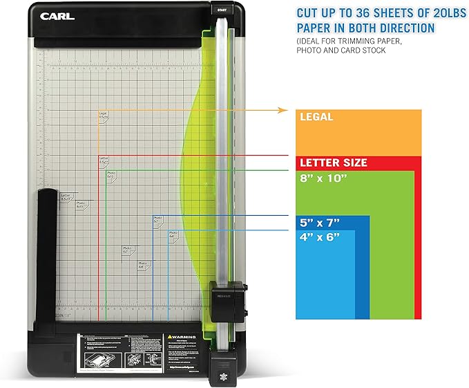 - Heavy-duty 36-sheet rotary trimmer with carbide blade, patented rail system, calibrated metal base board, adjustable magnetic paper guide and storage compartment.