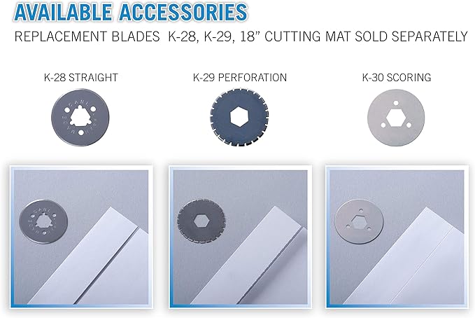 - A spare cutting mat, straight blade and perforating blade are included