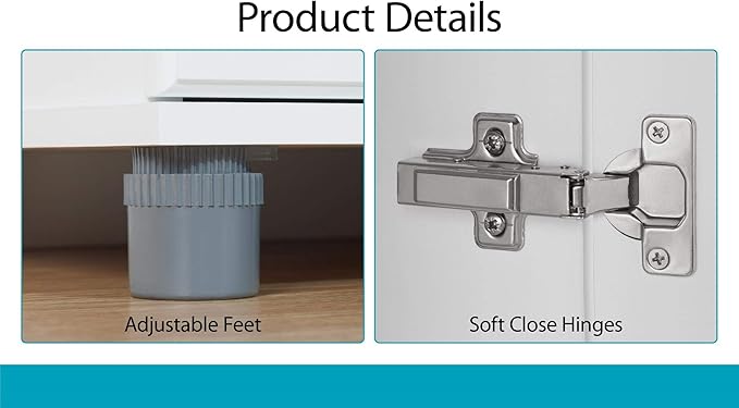 - The 5 shelves, 3 adjustable, can store and organize your cleaning supplies and even kitchen pantry items. Soft closing hinges prevent slamming doors. Adjustable feet keep your Cabinet level on uneven floors