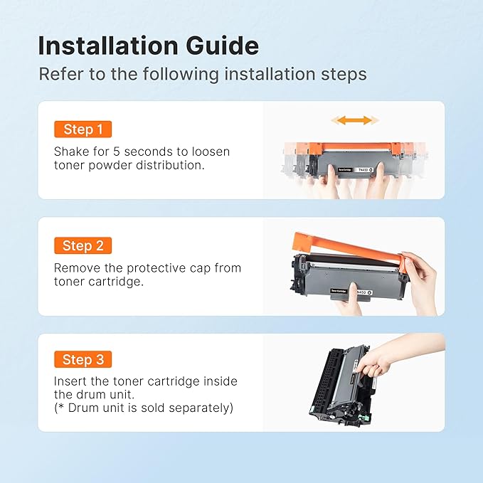 - Package contents: 1 x User Guide, 2 black TN450 toner cartridges (total 2 pack)