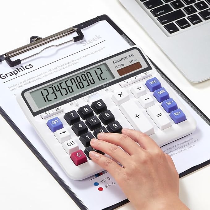 Comix Desktop Calculator Solar Battery Dual Power with 12-Digit Large LCD Display and Large Computer Keys Standard Function Calculator for Home Office School, White