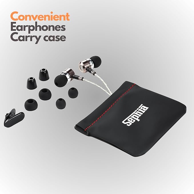 Sephia SP3060 Wired Headphones, HD Bass Driven Audio, Lightweight Aluminum Wired in Ear Earbud Headphones, S/M/L Ear Bud Tips, Earphone Case, 3.5mm Tangle-Free Cord, No Mic