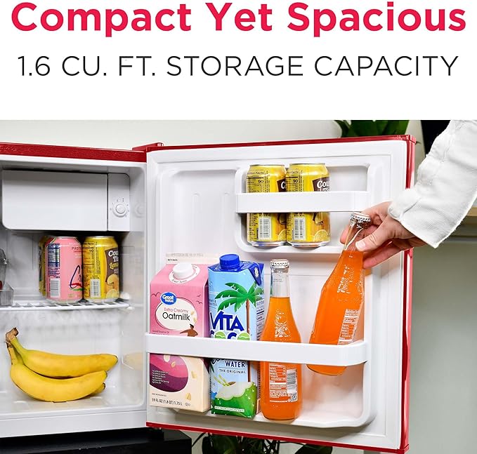 - SPACIOUS DESIGN: Featuring a 1.6 cu. ft. capacity, this compact fridge offers plenty of storage for bottles, cans, snacks, and more. The space-saving flush back design allows for seamless placement against walls, making it perfect for smaller spaces.