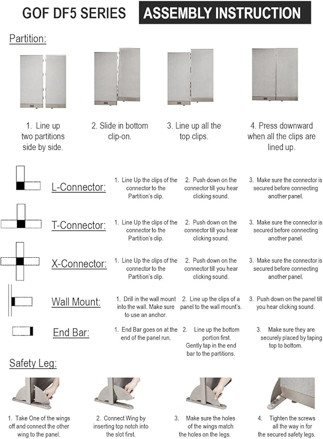 - Freestanding & Mounted : This single panel requires a separate purchase for freestanding use. For setups, use safety legs for straight-line arrangements. Secure panels to the wall with wall mounts, or connect multiple panels at 90 degrees using L, T, and X-post connectors to create dividers for workstations. Easy assembly allows for quick configuration changes