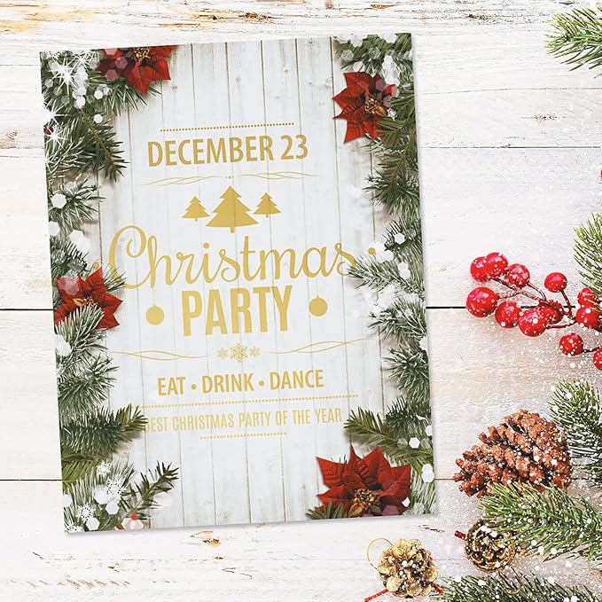 - SEASON’S GREETINGS: Vivid, edge-to-edge, full-color design with bright, seasonal patterns; Features a festive Christmas scene with vibrant poinsettias, pine, and a white wooden background