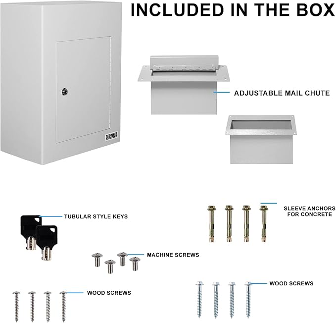 - SECURE β Designed with security in mind, this wall-mounted drop box features a reinforced double steel door, a durable piano hinge, and two internal metal baffles to prevent tampering, prying, or fishing. The tubular lock and key system offers additional protection against unauthorized access.