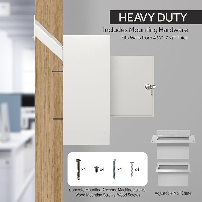 - VERSATILE APPLICATIONS β Compatible with walls ranging from 4-1/2" to 7-7/8" thick, making it a perfect fit for most residential and commercial spaces. This secure drop box provides a safe and tamper-resistant solution for storing mail, keys, rent, payments, checks, cash, donations, and other small valuables, protecting them from theft or loss.