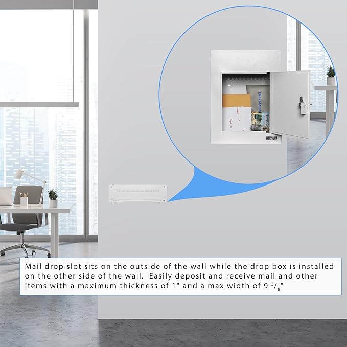 - PRACTICAL DESIGN - The Durabox Through-the-Wall Drop Box is expertly designed for seamless integration into walls, featuring a chute-style drop slot that allows for secure deposits from the outside while keeping contents safely stored inside. Simply drop in mail, payments, or small items from one side and retrieve them from the locking compartment on the other. Perfect for homes, offices, and businesses, this space-efficient design provides a secure and convenient solution for receiving and protecting important documents, cash, or valuables.