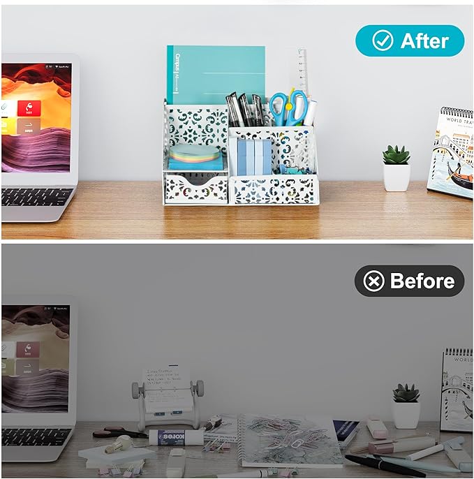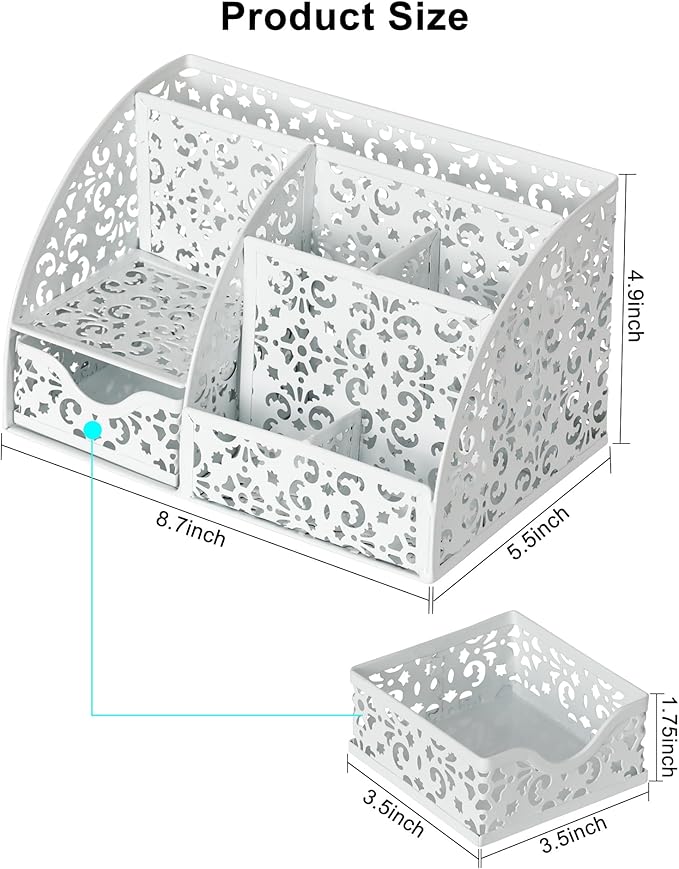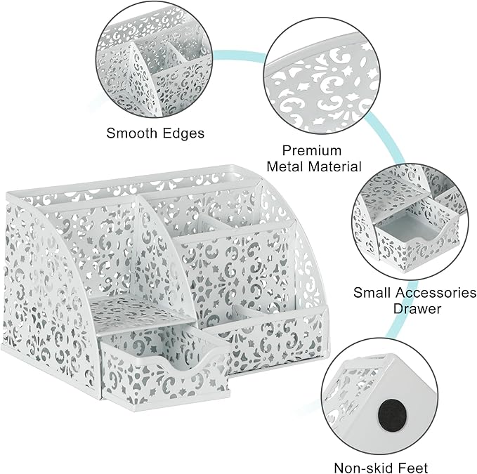 - Premium Metal Build: Made of metal with hollow flower patterns and anti-rust powder finished, this desk caddy combines elegance with functionality. Smoothed edges and a chip-resistant coating ensure long-lasting beauty.