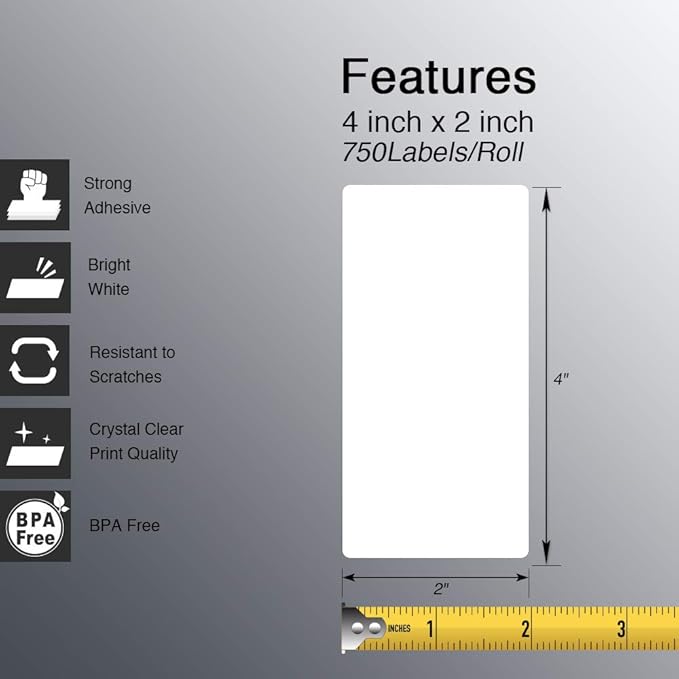 - [ Specifications ]: 4 in x 2 in (102 mm x 51 mm) (750 Labels/Roll, 1 Roll),Paper tube diameter:1"(25.4mm). No Ink Toner or Ribbons Needed! Save your money and effort.