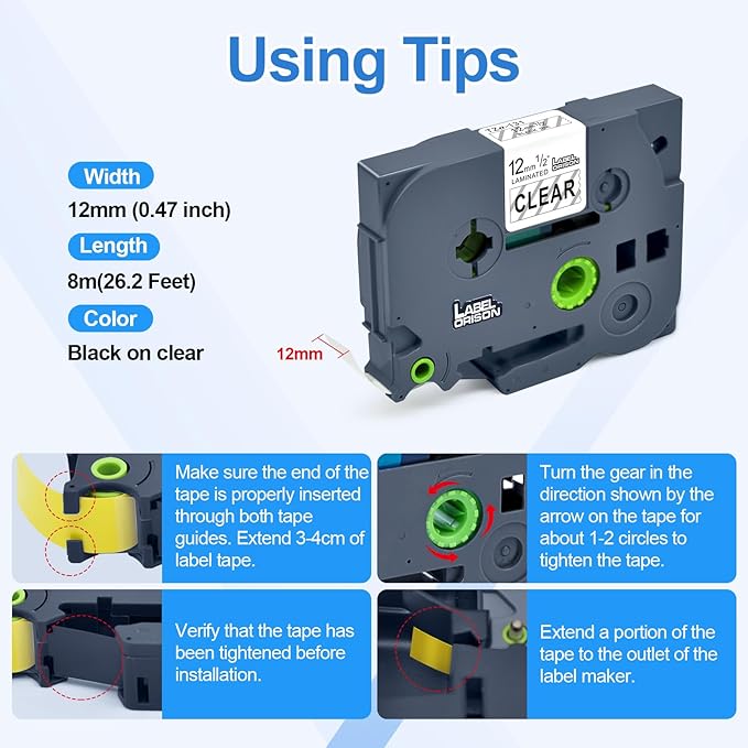 - Color & Dimension: P-touch tape laminated.Color:black on clear;Size:1/2 inch (12mm) widthx26.2 feet (8m)length,long lasting and smooth printing text.2rolls labeling tape packed in a box