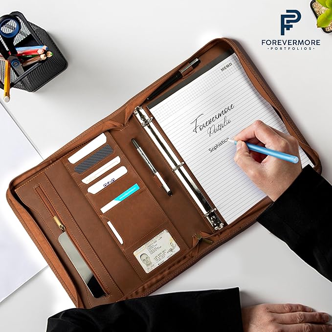 Forevermore Portfolios Padfolio Binder - Professional Faux Leather Travel Organizer Pouch for Tablet, Documents, Presentation Folders, Zipper Closure, Removable 3-Ring Notepad - Brown