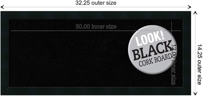 - DIMENSIONS: The overall size of this framed corkboard measures 32 in. x 14 in., including the frame. Its functional cork board area measures 30 in. x 12 in.