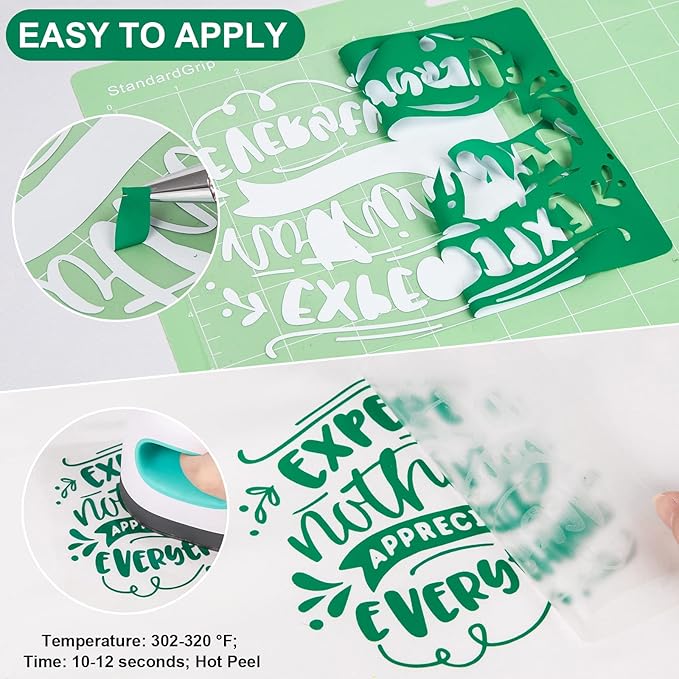 - Easy to apply: Use a craft cutter and home iron to apply for 10-12 seconds at 302-320 F (150-160 C) with 10 LBS pressure. Cold peel after application