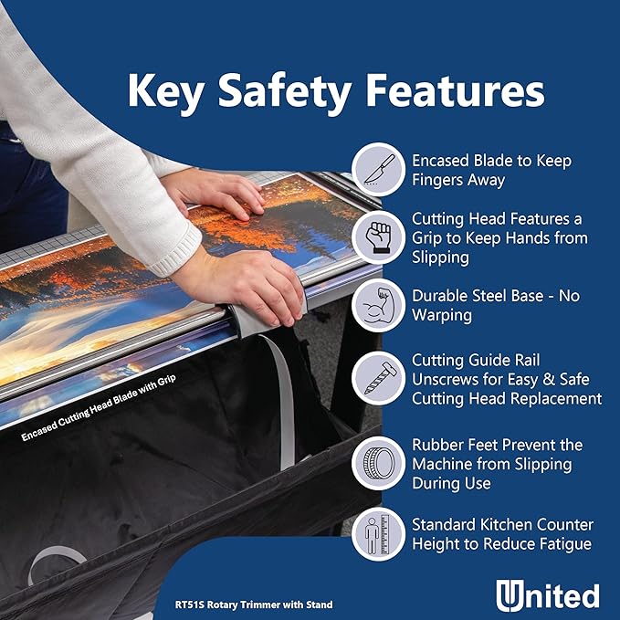 - DURABLE AND SAFE: Built to withstand heavy use, this rotary paper trimmer is crafted with a rugged steel base and sturdy stand for superior durability. The slider paper cutter blade is housed in a palm-sized easy grip cutting head, keeping hands safely away from the trimmer blade.
