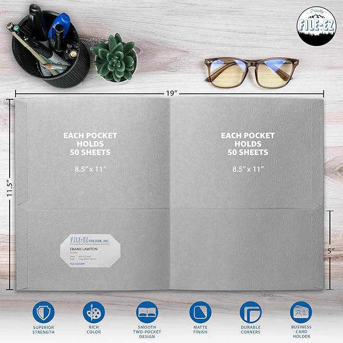 - PACKAGE INCLUDES: Your selected PACK SIZE and COLOR of Two-Pocket Folders constructed using Textured Paper, Matte Finish, Supports Letter Sheet Size (8 1/2" x 11")