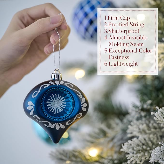 - 【Variety of Patterns and Molds】 This christmas set includes a variety of tree ornaments, featuring balls in different patterns and shapes such as baroque painting, wave painting, snowflake, finial, reflector teardrop shaped ball, onion shaped ball, diamond-patterned ball, and snowflake-engraved ball. The diverse patterns complement each other well, adding interest and charm to your overall decor
