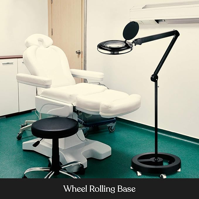 - Magnifying Floor Lamp with 6 Wheels: This floor lamp for reading has multiple testimonials from aging customers and those with macular degeneration, which requires extra light and magnification for full contrast and details. The magnifying floor lamp has 6 wheels that roll easily, which is ideal for estheticians, spas and salons, beauticians, dermatologists, tattoo artists, jewelers, dentists, etc. Great for use with lash extensions, facials, and similar treatments under bright LED light.