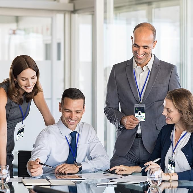 Fushing 50pcs Clear Plastic Vertical Name Tags Badge ID Card Holders and Blue Neck Lanyards with Swivel Hook for School, Festival, Event (L)