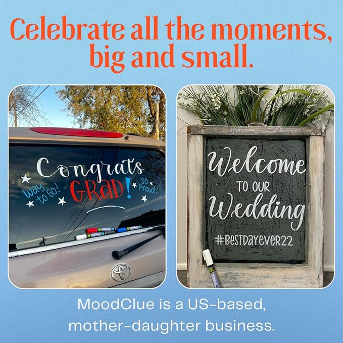 - π₯ GREAT FOR HOME / SCHOOL / WORK - Use MoodClue's fun, bright liquid chalk markers on glass, mirrors, windows, many appliances, stainless steel, sealed tiles and stone, glassboards / whiteboards / bistro boards / most blackboards. These erase easily from non-porous surfaces. Brighten up your day and make your point.