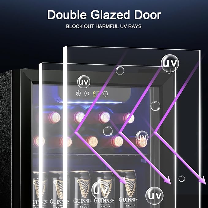 - IDEAL LIGHT and HUMIDITY: With its reinforced glass door with air tight seal and help to maintain an ideal humidity level, this beverage refrigerator gives you a compact and modern design better for your living room. Blue soft LED interior lighting not only beautifully showcases the wine but won’t damage the wine.