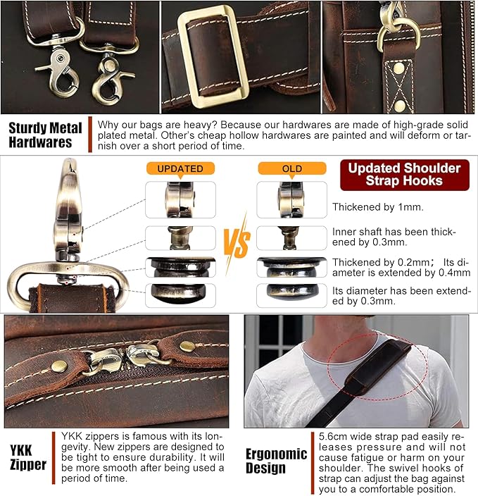 - 【Special Feature】The leather laptop briefcase can hold 2 computers at the same time. 1 removable sleeve for 17.3" laptop and 1 fasten sleeve for 16.5" to 17” laptop. The laptop bag has been updated to ykk metal zippers, which can bear 1000 times pull strength testing, to ensure quality and reliability. Shoulder straps hooks are upgraded to ensure durability.