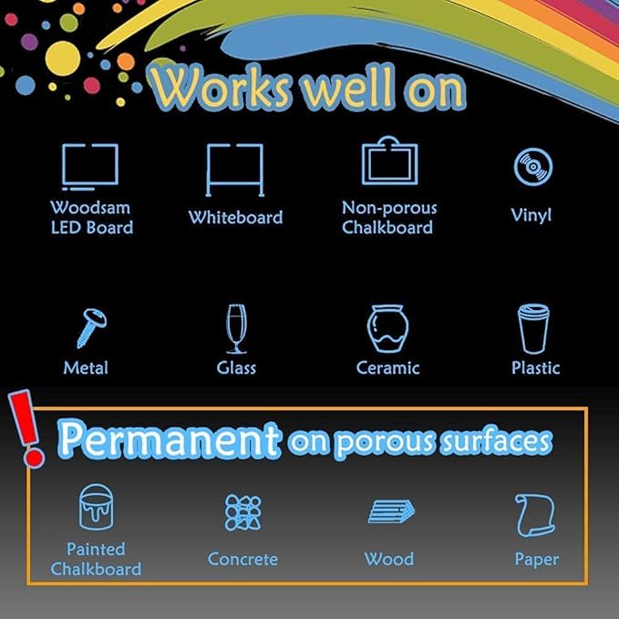 - Works on Multiple Surfaces: Our chalk markers write smoothly on most non-porous surfaces including metal, chalkboard labels, LED boards, plastic, glass, mirrors & slate. Perfect for kitchen canister labels, stencils, scrapbooking, restaurant menu, and retail advertising displays.