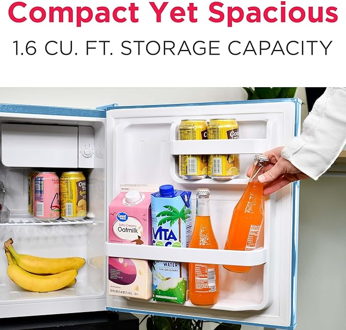 - SPACIOUS DESIGN: Featuring a 1.6 cu. ft. capacity, this compact fridge offers plenty of storage for bottles, cans, snacks, and more. The space-saving flush back design allows for seamless placement against walls, making it perfect for smaller spaces.