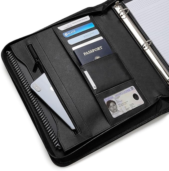 - Secure Your Documents - Keep important files and folders secure while you're out and about. This travel portfolio binder features a zipper closure to keep all your essentials from falling out.