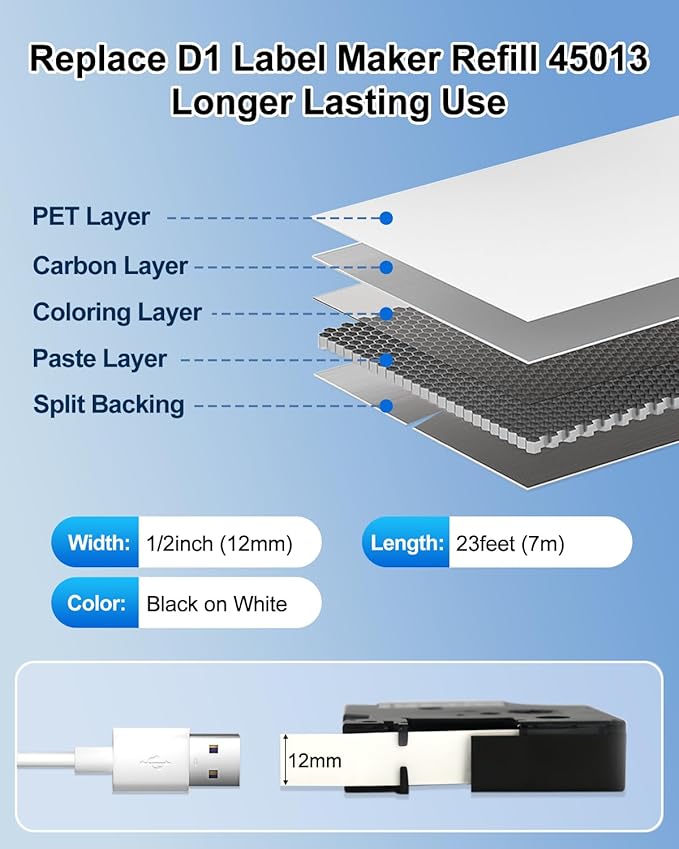 - Features: Compatible with Dymo Label Maker Refills D1 45013 Tape are long-lasting and practical materials that are water resistant, chemical resistant, grease resistant, grime resistant, abrasion resistant, fade resistant and endures temperatures. Split Backing for Easy Peeling and No Sticky Residue when Removed.