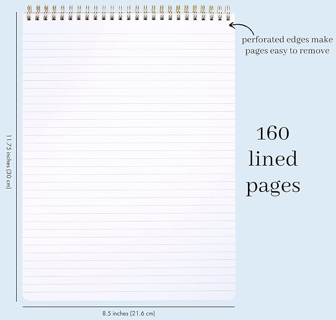 - Includes 80 (total of 160 front and back with a perforated edge) college-ruled lined pages that are thick to prevent bleed-though. The spiral binding is on the top of the notepad to make writing more convenient (it’s perfect for lefties!)