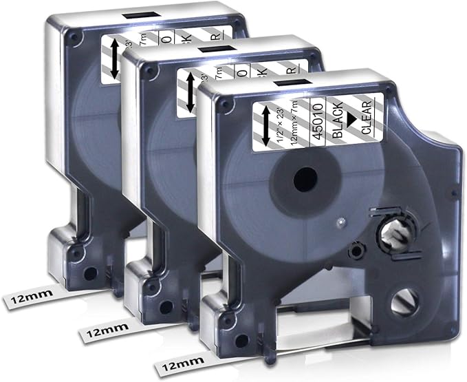 - Package Including: 3 Pack Compatible with DYMO D1 Label Tape 45010 S0720500. Color: Black on Clear. Size: 1/2 Inch (12mm) Width, 7m (23feet) Length.