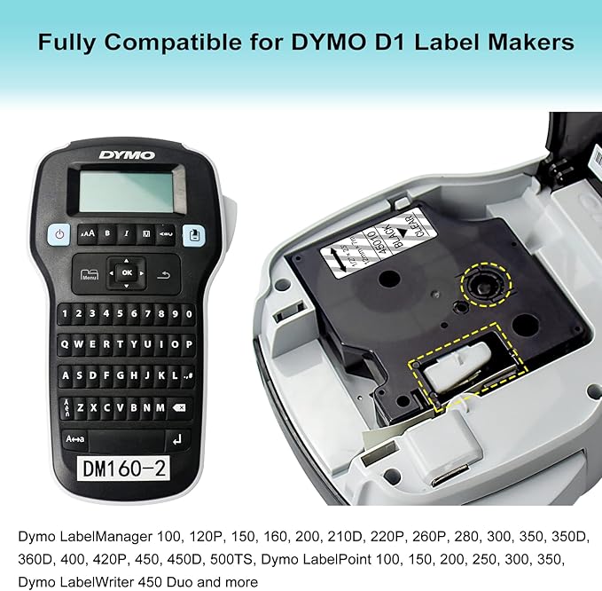 - Fully Compatible with Dymo LabelManager 100 120P 150 160 200 210D 220P 260P 280 300 350 350D 360D 400 420P 450 450D 500TS PC PC II PnP Wireless PnP, LabelPoint 100 150 200 250 300 350, Compatible with Label Writer 400 Duo 450 DUO. More compatible label makers see the product description.