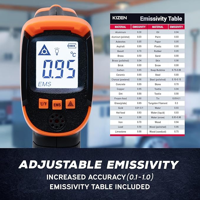 - PRECISION MEASUREMENTS FOR COOKING: Know how hot your cooking surfaces are before you start cooking. Good for pizza ovens, griddles, ovens, pans and more. The digital infrared thermometer gun for cooking offers an emissivity range from 0.1 to 1.0, ensuring precise temperature readings across diverse surfaces and conditions. For optimal accuracy, maintain a 14-inch distance from the target object with the temperature thermal gun.
