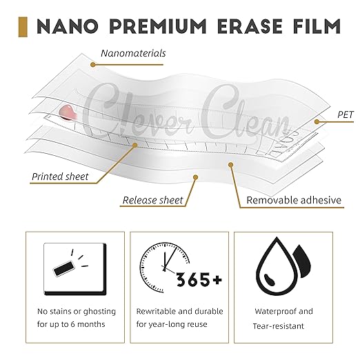 - NEW TECHNOLOGY, NEW EXPERIENCE - Customer's experience is very important to us, so we use the nano premium erase film on our products. Compared to the old PET film, the nano material will make your writings super easy to be wiped off even after you leave the writings on the goal sticker for a very long time. And it won’t leave any stains or ghosting. The nano film is also waterproof, so if you want to clean the sticker with a wet cloth. Just do it.