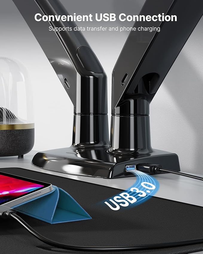 - Increased Stability & Convenience - The enlarged base and sturdy construction ensure huanuo dual monitor stand superb stable. Supports both clamp and bolt-through grommet mounting for desk thicknesses up to 3.54". The hole for grommet mounting should be 0.39" to 1.97" in diameter; the built-in USB port provides an easy way to charge your USB devices.