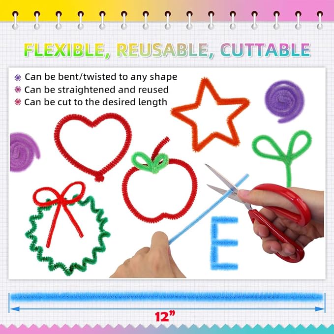 - [FLEXIBLE, REUSABLE, CUTTABLE] The pipe cleaners are so flexible that you can easily bend, twist or wrap the pipe cleaners into any shape. The bendable chenille stems can be straightened and reshaped without getting broken. The flexible chenille stems inspire your imagination and gives you freedom to reuse them for many hours of enjoyment. The pipe cleaner length is standard 12”. When needed, you can use a scissor to cut pipe cleaners into various lengths for special craft needs