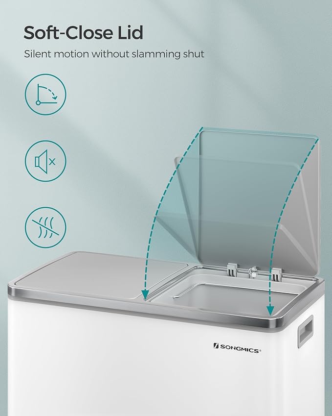 - [What You Get] A dual trash can sized at 23.2”L x 14.4”W x 25.6”H with 2 x 10.6-gallon compartments, 15 trash bags, plastic inner buckets, and a soft closure mechanism for easy waste disposal