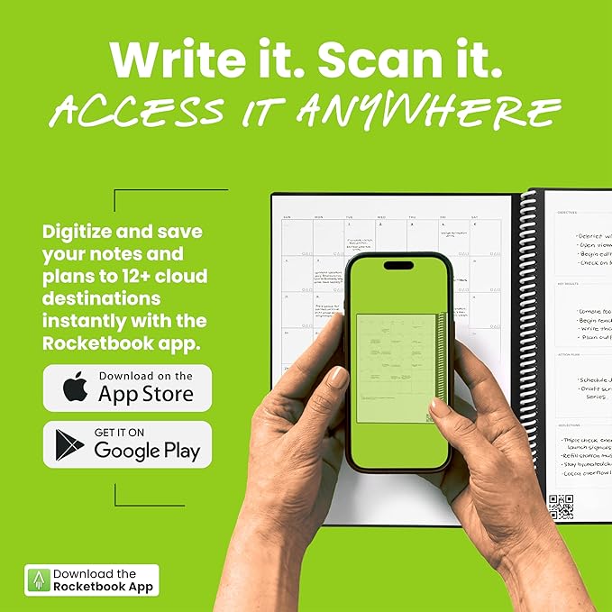 - App-Enabled for Digital Organization: The Rocketbook app allows you to scan and upload your plans & lists directly to cloud platforms like Google Drive, Dropbox, OneNote, etc. The app-connection ensures your notes are accessible from anywhere.