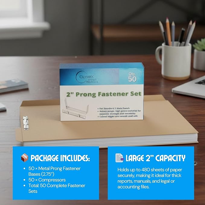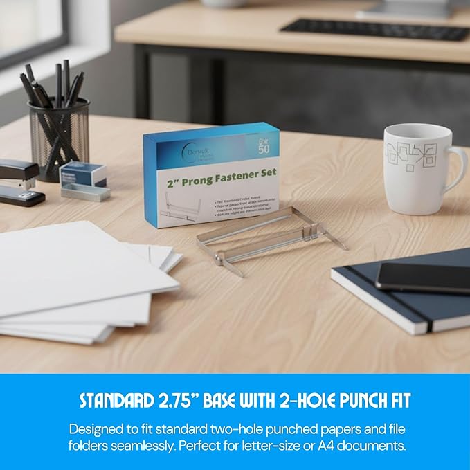 OLYMPX 50 Pcs of 2ā Capacity Premium Metal Prong Paper Fastener Complete Set, 2.75 Inch Base with Standard 2-Hole Punch Compressor for Paper File Folder, 50 per Box