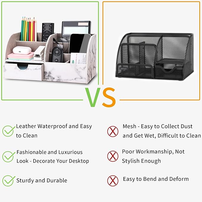 KINGFOM Pu Leather Desk Organizer Pen Pencil Holder Office Supplies Caddy Storage Box 6 Compartments with Drawer Gray Marble