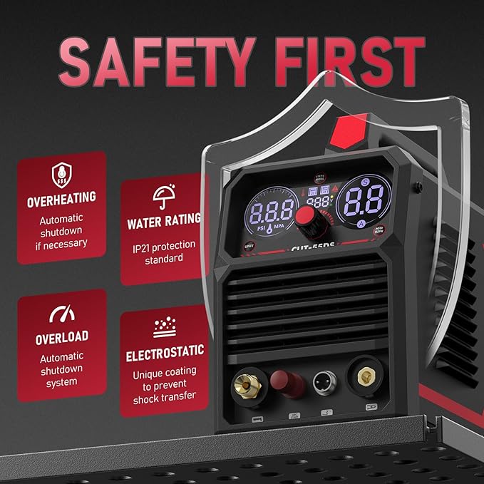 - POWERFUL CUTTING CAPACITY: Featuring a 20-55A current output, it delivers deep cutting thickness. Ideal clean cut: 3/10''@110V,1/2''@220V, max cut: 3/5''@110V,4/5''@220V. Uses non-hazardous compressed air to cut stainless steel, alloy steel, mild steel, copper, and aluminum.