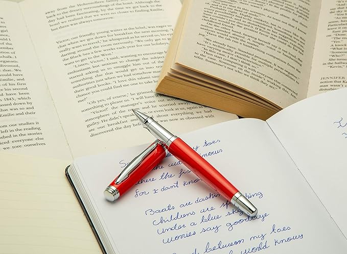 - THE ROYAL STANDARD IN PENMANSHIP- Created to cater to a highly demanding audience, the elegant ZenZoi luxury rollerball pen brings together finesse and functionality, into a timeless writing piece. Minimalistic design elements combine on a brass metal body with a lacquered red and silver scheme, for the ultimate writing experience.