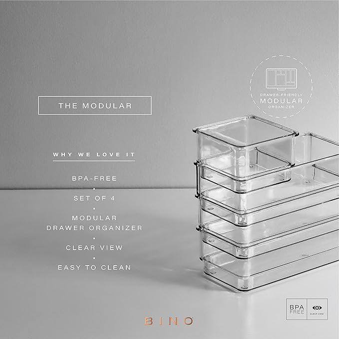 BINO 4-Piece Modular Drawer Bin Set | Bathroom & Vanity Drawer Organizer Trays - Small
