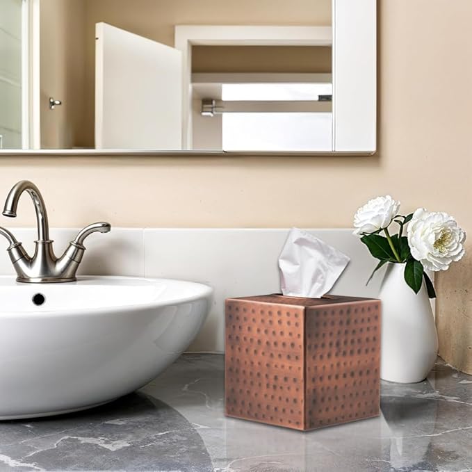 - STYLISH & PERFECTLY SIZED: Measuring 5" x 5" x 5.25", this square tissue box cover delivers the perfect blend of elegance and functionality. The sleek design of this hand-hammered tissue cover complements any room—whether you're decorating a modern bathroom, cozy bedroom, or organized office. Use it as a decorative tissue box holder to enhance countertops, vanities, nightstands, desks, or side tables.