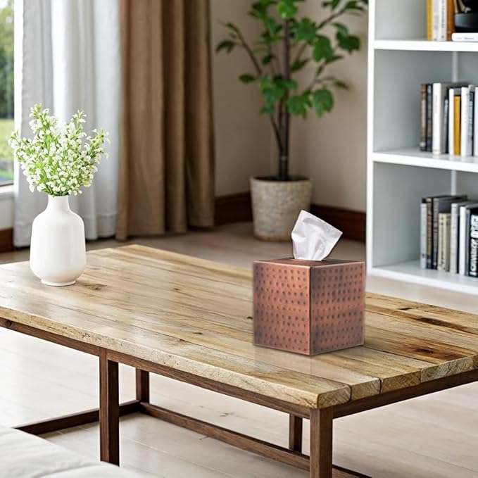 - VERSATILE & DURABLE: Upgrade your space with our handcrafted hammered tissue box cover square. Designed to fit standard square tissue boxes, this stylish tissue holder adds a decorative touch to your bathroom vanity, bedroom nightstand, office desk, or living room end table. Its durable metal construction ensures long-lasting use while keeping tissues neatly concealed and easily accessible. Also fits stacks of individual napkins for added versatility.
