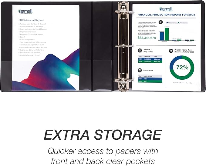 - Professional Look: Designed to impress during presentations and look great on a shelf, our 3-ring binder features back-lid-mounted D-shaped binder rings for a rivetless spine