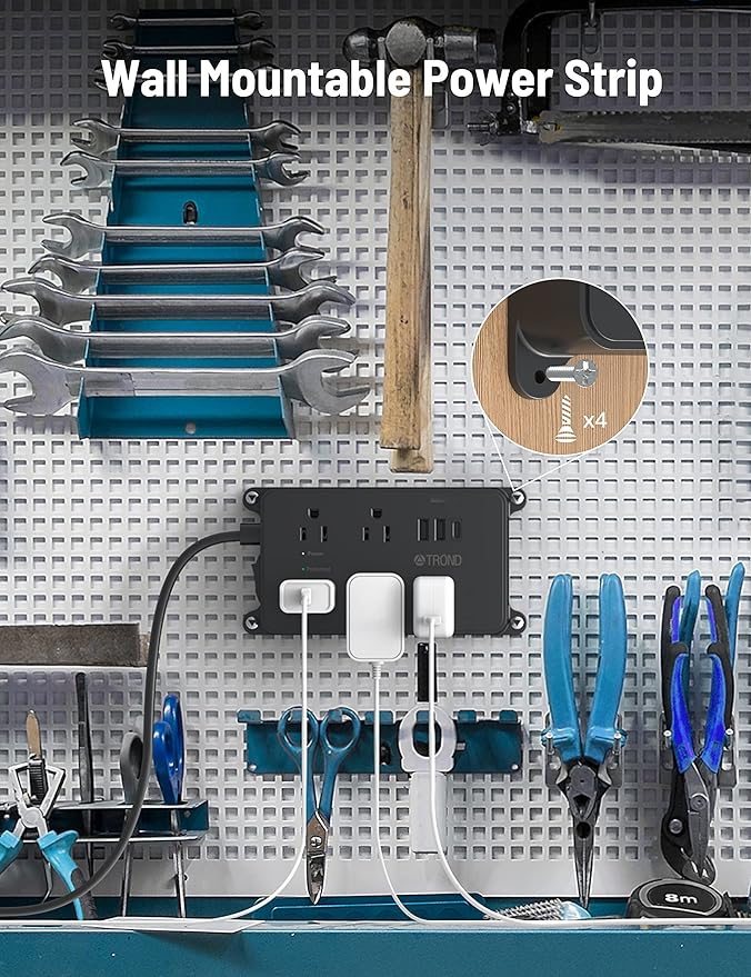 - Wall Mountable Power Strip: This wall mount power strip is a screw mountable design. Four screw-mounting tabs allow you to securely install this power strip and easily be reached, including behind the TV, workbench, garage, bedside, bathroom, laundry room, or under desk or cabinet, which is very low-profile and saves desktop space for you