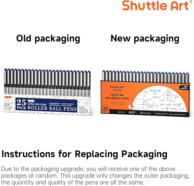 - CONVENIENT VALUE PACK: Shuttle Art 25 pack 0.5mm roller ball pens are all with blue ink. 25 Combo Pack will fully meet your demands of daily writing, marking and signing.