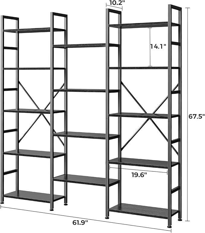 SUPERJARE Triple 5 Tier Bookshelf, Bookcase with 14 Open Display Shelves, Wide Book Shelf Book Case for Home & Office, Black